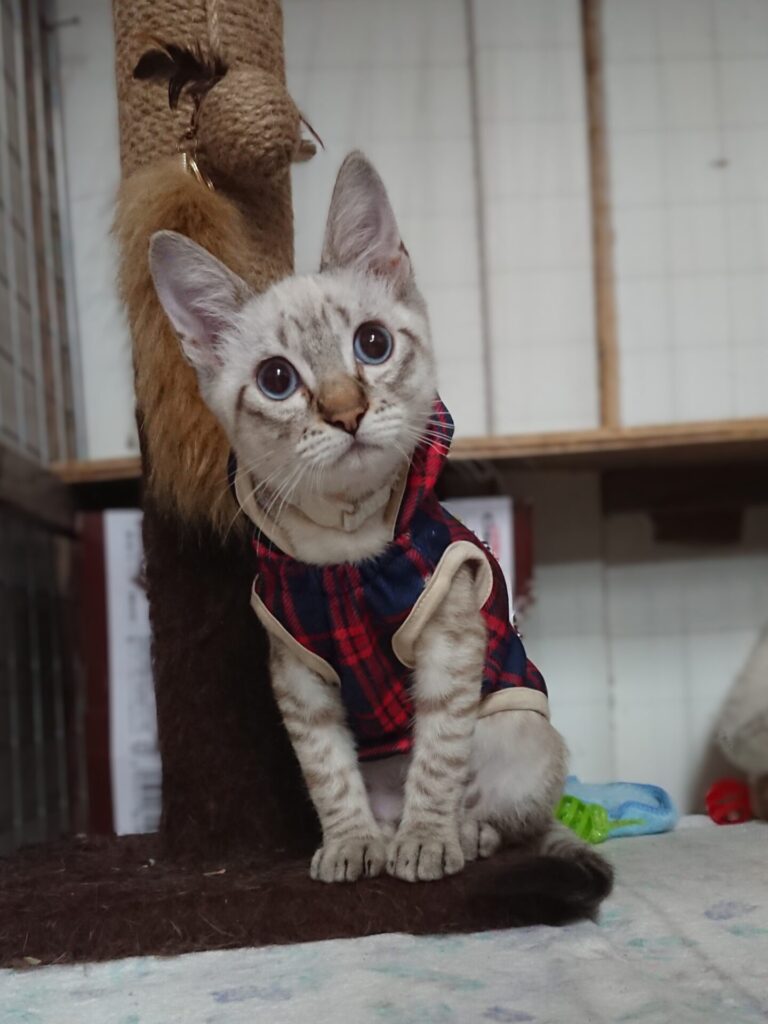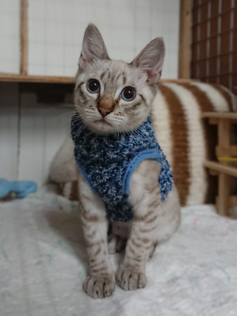 普通の子猫よりもやや体格が小さかった(成長が遅かった)暖に小型犬用の洋服はジャストフィットだった。