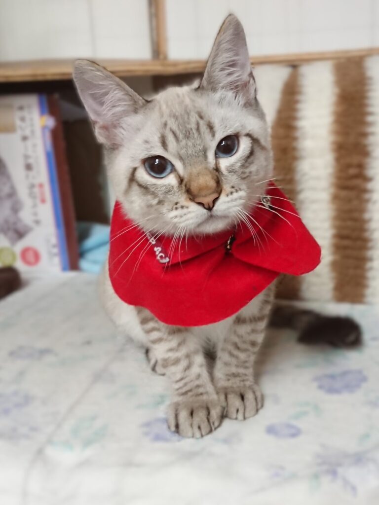 当然、ノミ寄生予防薬(以下、ノミ予防薬)の舐め防止用の赤いケープもおそろいだ。