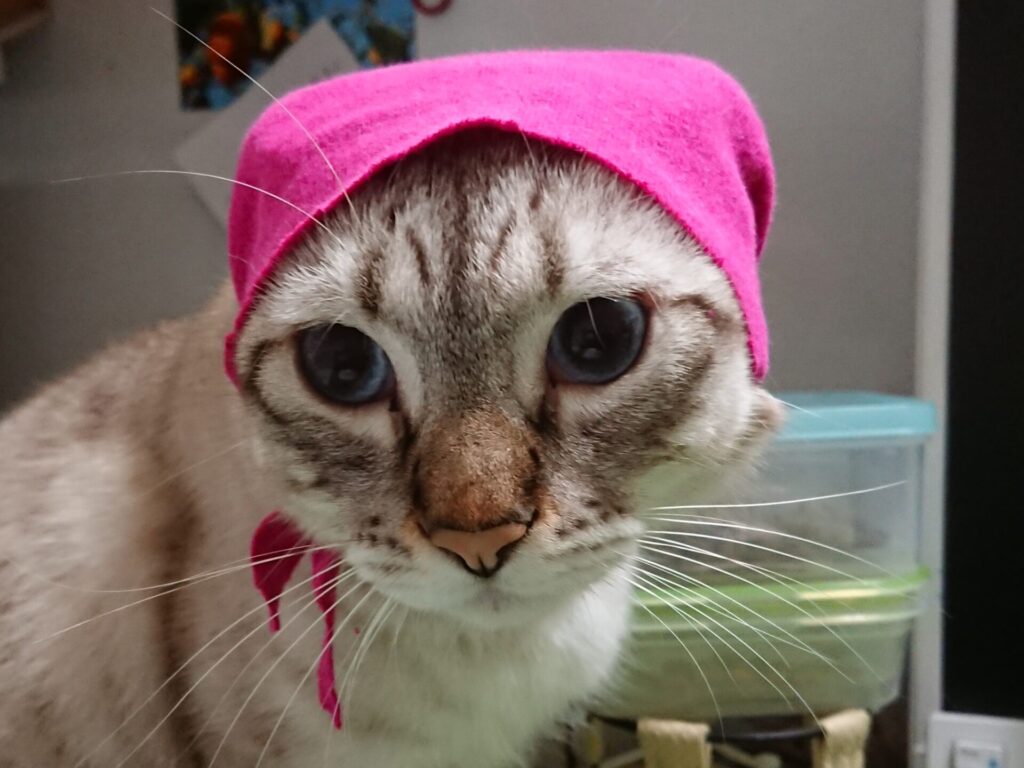 ピンクの三角頭巾は、職場組警備犬・ふくにバンダナ風首輪を作った際に余った生地を被せた写真だ。