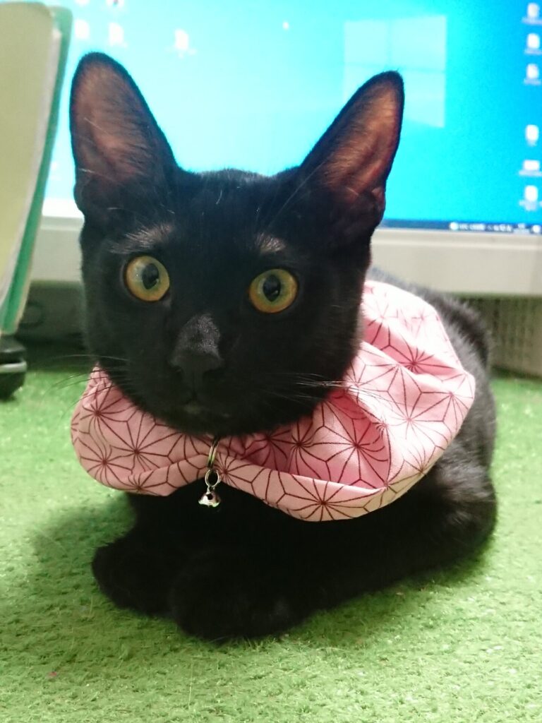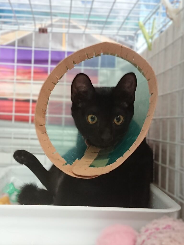 術後のエリザベスカラーは温と暖のおさがりを使おうとしたが、三角小顔の現にはサイズが大きかった。