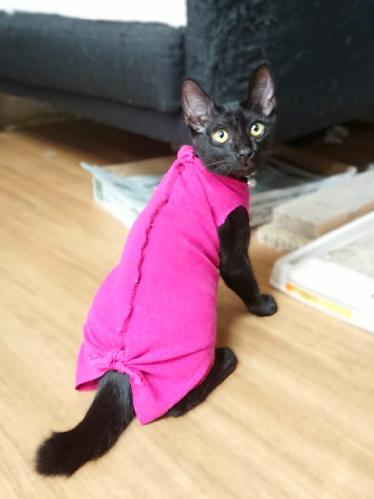 大人用の服を猫用にサイズ調整するよりも赤ちゃん用のロンパースの方がはるかに使いやすい。