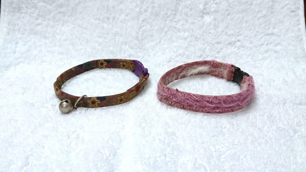 2頭とも現在の首輪がきつくなってはいなかったが、しろみは太ったことで元々あったはずの首周りのゆとりが少なくなっていた。